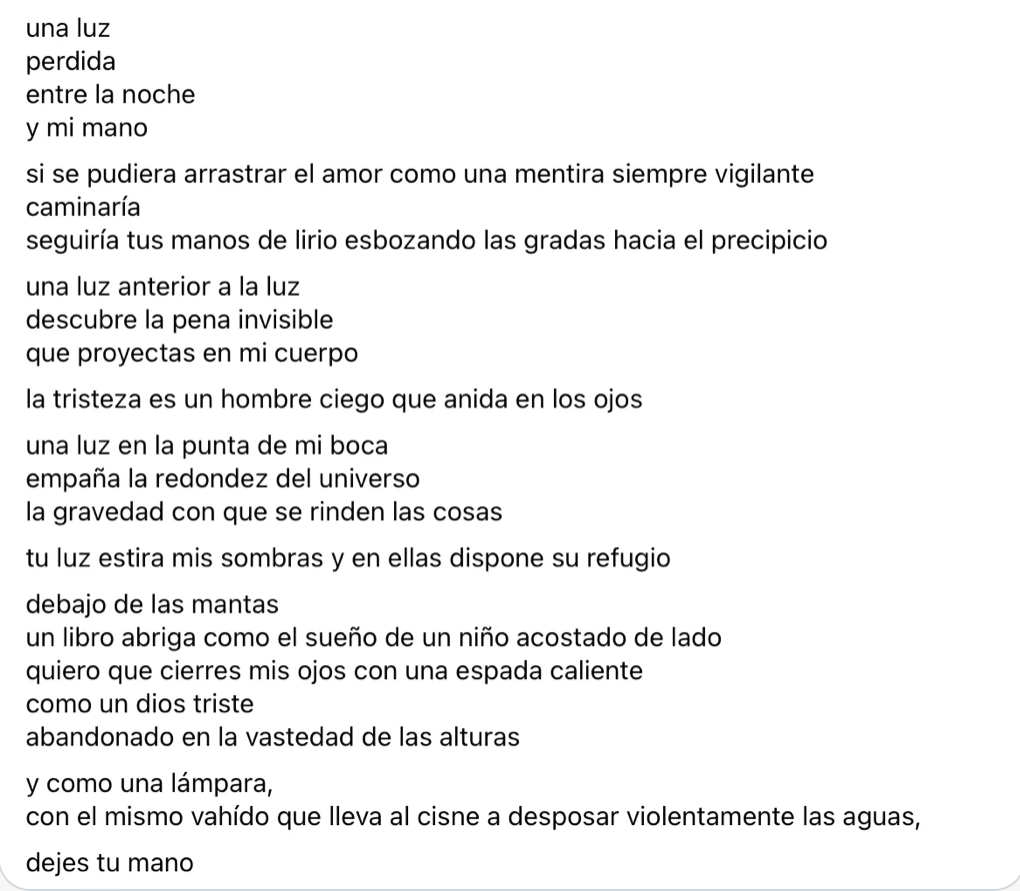 «Una luz» De: Blanco es el sueño de la noche (2008) de Lena Retamoso Urbano. Comparte esto: Compartir en X (Se abre en una ventana nueva) X Comparte en Facebook (Se abre en una ventana nueva) Facebook Me gusta Cargando... Relacionado De Lena Poeta View all of Lena's posts.