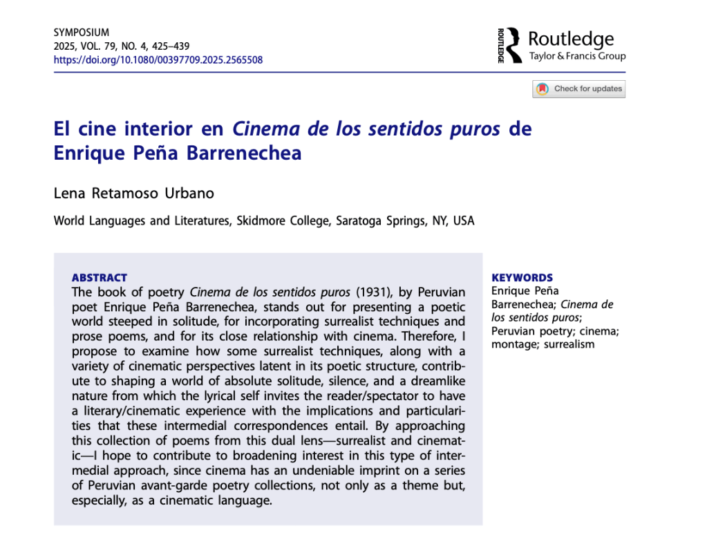 Muy feliz de compartir la noticia de la publicación de mi artículo: «El cine interior en Cinema de los sentidos puros de Enrique Peña Barrenechea» como parte del volumen editado por Chrystian Zegarra: Literary Cinescapes: Film and Literature in the Latin American Avant-Garde (1920-1930).Very happy to share the news of the publication of my article: ‘The Inner Cinema in Cinema de los sentidos puros by Enrique Peña Barrenechea’ as part of the edited volume by Chrystian Zegarra: Literary Cinescapes: Film and Literature in the Latin American Avant-Garde (1920-1930).